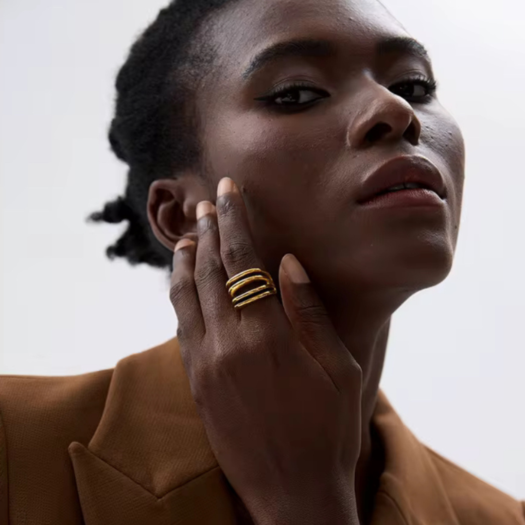 Nerida — a ring that wraps the finger like a stream of light. Its fluid form and golden glow carry elegance and calm.